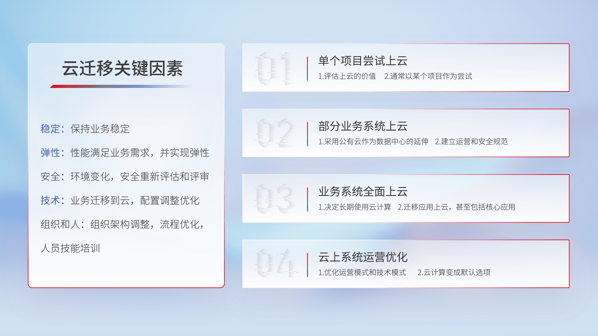 结合实际业务,,,,从规划设计、、、云平台选型、、、、云原生改造、、、数据迁移、、、、集成交付,,,,迁移全过程为客户识别最佳上云路径,,,做好风险识别管理,,设计网络架构、、身份权限、、安全审计合规、、、操作审计、、日志审计、、、监控告警策略、、多站点容灾设计等,,,对云上基础设施进行整体规划,,提升IT治理水平,,,,以满足弹性、、、、高可用、、、高性能的需求。。