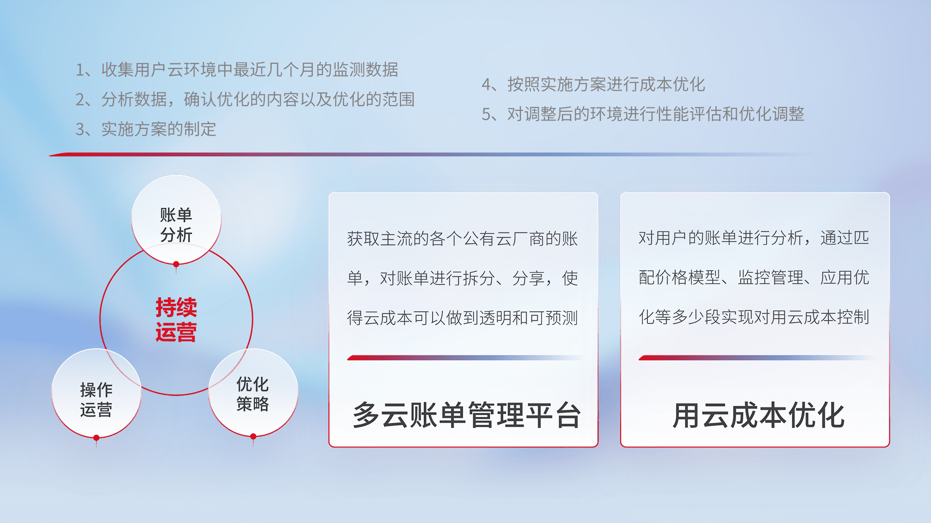 通过多云纳管,,,,以统一的资源数据模型把客户的云资源进行抽象和封装,,,,进而实现对多云资源的统一操作,,,保障云资源管理的可靠性、、、、稳定性与可用性。。。。量身定制化运维内容,,配置、、、开发运维、、、、补丁管理、、备份、、、、监控、、、、认证和访问管理、、、、审计和日常巡检等,,,,保障在用云过程中的可靠度,,,稳定度以及高可用率。。