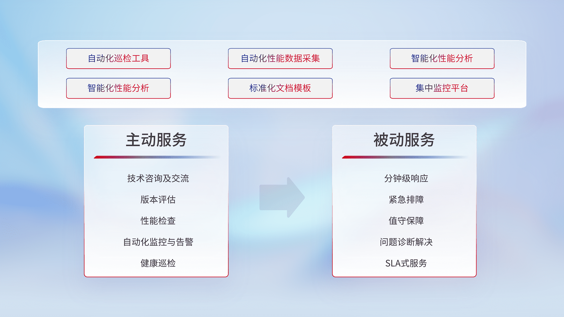 智能化工具和标准化文档,,保障服务质量,,提供主动服务(包含技术咨询、、、版本评估、、性能检查、、、、自动化监控与告警、、、、健康巡检)和被动服务包含(分钟级响应、、、、紧急排障、、值守保障、、问题诊断解决、、、、SLA服务)。。。