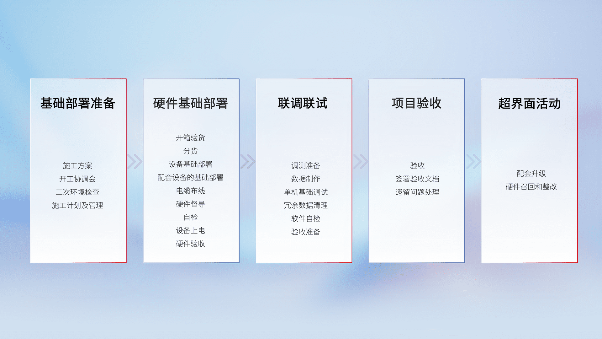 从基础部署准备、、、、硬件基础部署、、、、联调联试、、、项目验收、、、越界面活动的全过程可追溯,,,保证施工质量和进度。。